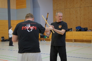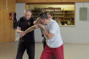 mit Messer und Stock, speziell für die Abwehr bewaffneter Angriffe.